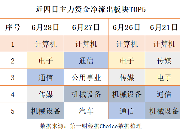 据第一财经统计,从6月28日资金流向上看,计算机、电子、通信成为前三大主力资金净流出板块,分别为71.95亿元、37.59亿元、26.37亿元;拉长至近4日,计算机行业的主力资金净流出规模均居首位,累计净流出资金超360亿元;通信行业也同样保持前五之列,累计净流出124.79亿元;此外电子、传媒等行业的累计净流出资金同样在200亿元左右,分别为200.64亿元、198.99亿元。