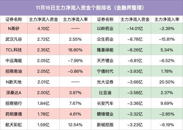 其中净流入最多的个股是甬矽电子、武汉凡谷和TCL科技,分别净流入4亿元、2.7亿元和2.3亿元。净流出最多的个股是以岭药业、众生药业和隆基绿能,分别净流出14亿元、8.7亿元和8.2亿元。