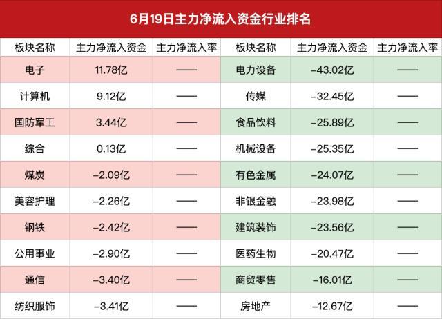 资金流向上,电子、计算机、国防军工行业板块获主力净买入居前,分别净买入11.78亿元、9.12亿元、3.44亿元。电力设备、传媒、食品饮料等行业板块遭主力净卖出居多,主力分别净卖出43.02亿元、32.45亿元、25.89亿元。