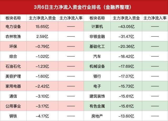 资金流向上,2个行业获主力资金净流入,其中电力设备行业获主力净流入17.72亿元居首;农林牧渔行业主力净流入2.59亿元。主力资金净流出的29个行业中,计算机行业净流出43.05亿元,非银金融净流出31.47亿元,基础化工净流出20.36亿元。