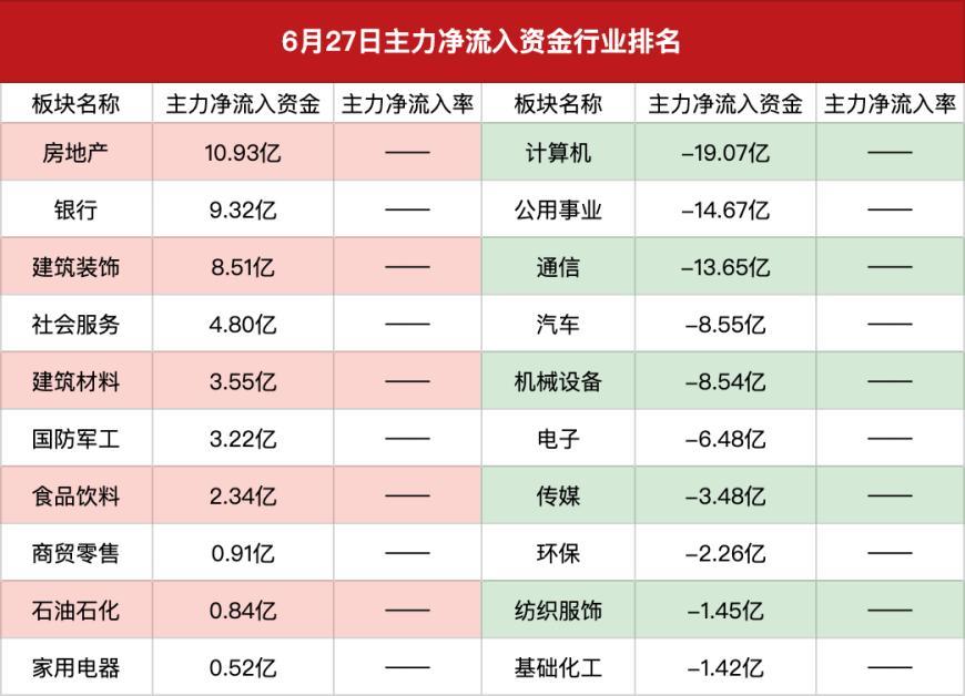 资金流向上,房地产、银行、建筑装饰行业板块获主力居前,分别净买入10.93亿元、9.32亿元、8.51亿元。计算机、公用事业、通信等行业板块遭主力净卖出居多,主力分别净卖出19.07亿元、14.67亿元、13.65亿元。