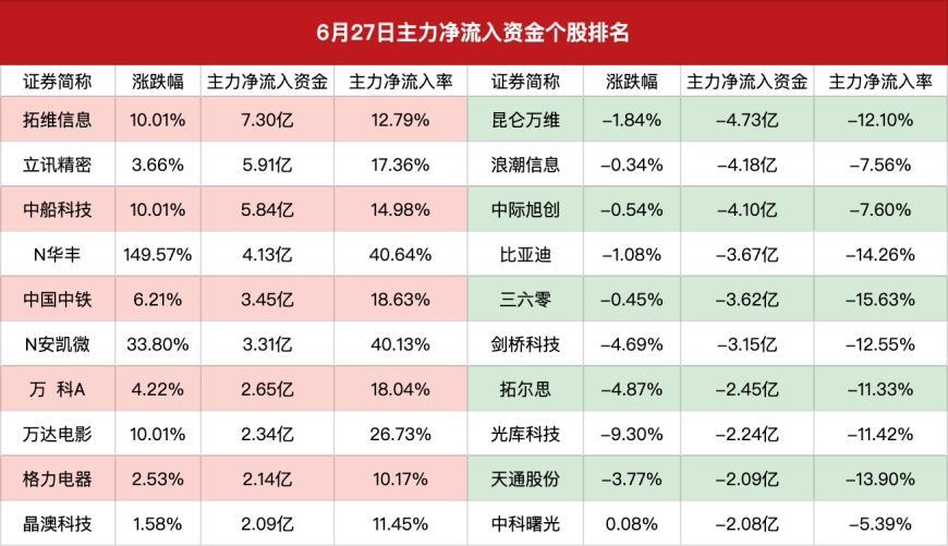 拓维信息、立讯精密、中船科技分别获主力净买入7.3亿元、5.91亿元、5.84亿元,昆仑万维、浪潮信息、中际旭创分别遭主力净卖出4.73亿元,4.18亿元,4.1亿元。
