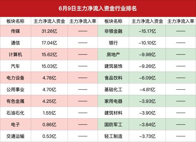 资金流向上,传媒、通信、计算机等行业板块获主力净买入居前,分别净买入31.26亿元、17.04亿元、15.62亿元。非银金融、银行、房地产等行业板块遭主力净卖出居多,主力分别净卖出15.17亿元、10.1亿元、9.98亿元。