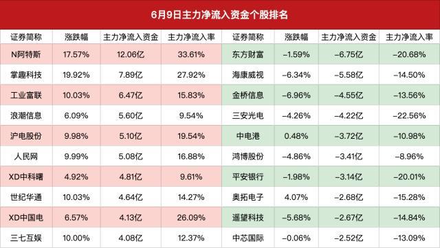 阿特斯、掌趣科技、工业富联分别获主力净买入12.06亿元、7.89亿元、6.47亿元,东方财富、海康威视、金桥信息分别遭主力净卖出6.75亿元,5.58亿元,4.55亿元。