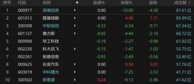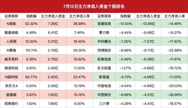N昊帆、隆基绿能、人民网分别获主力净买入7.28亿元、6.41亿元、5.01亿元,浪潮信息、赛力斯、中科曙光分别遭主力净卖出12.68亿元,9.48亿元,7.27亿元。