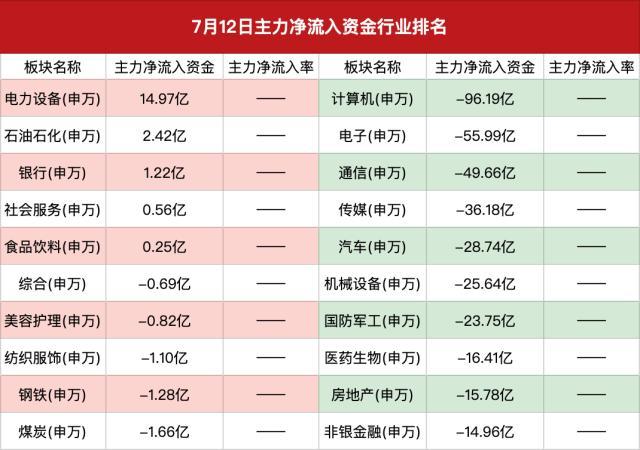 资金流向上,电力设备、石油石化、银行行业板块获主力居前,主力分别净买入14.97亿元、2.42亿元、1.22亿元。计算机、电子、通信等行业板块遭主力净卖出居多,主力分别净卖出96.19亿元、55.99亿元、49.66亿元。