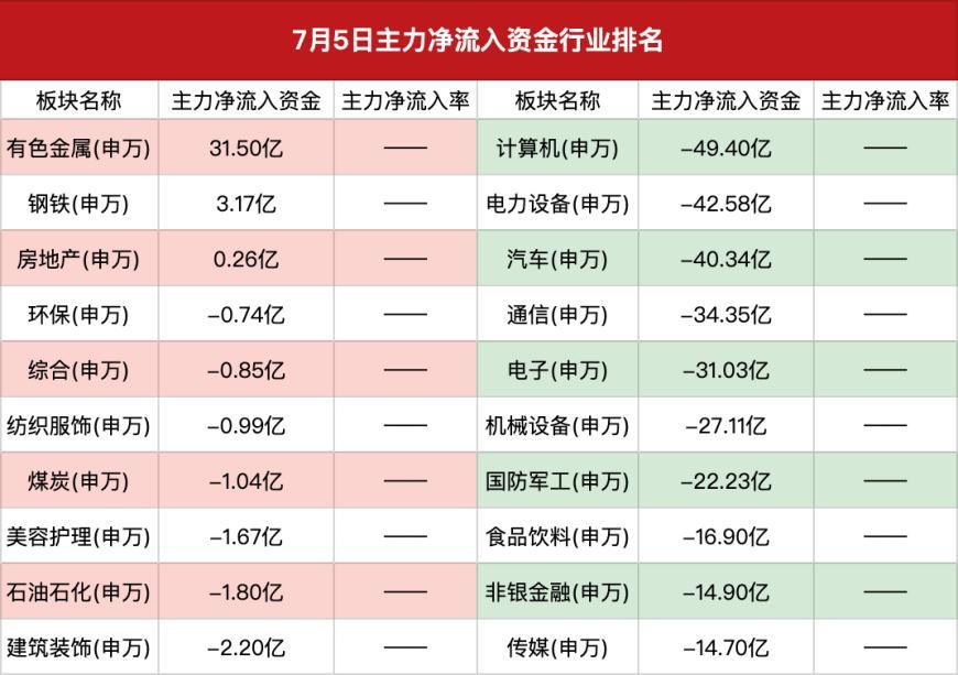资金流向上,有色金属、钢铁、房地产行业板块获主力居前,主力分别净买入31.5亿元、3.17亿元、0.26亿元。计算机、电力设备、汽车等行业板块遭主力净卖出居多,主力分别净卖出49.4亿元、42.58亿元、40.34亿元。