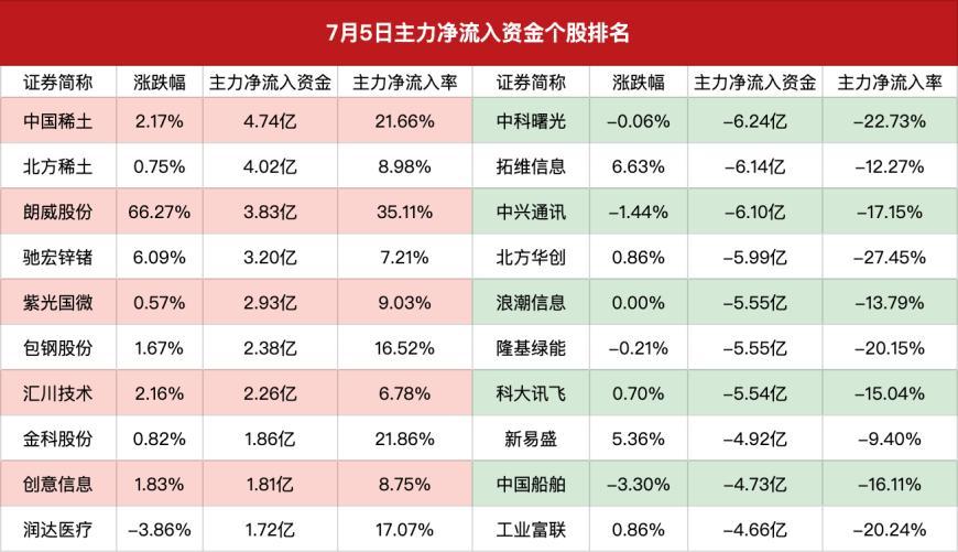 中国稀土、北方稀土、朗威股份分别获主力净买入4.74亿元、4.02亿元、3.83亿元,中科曙光、拓维信息、中兴通讯分别遭主力净卖出6.24亿元,6.14亿元,6.1亿元。