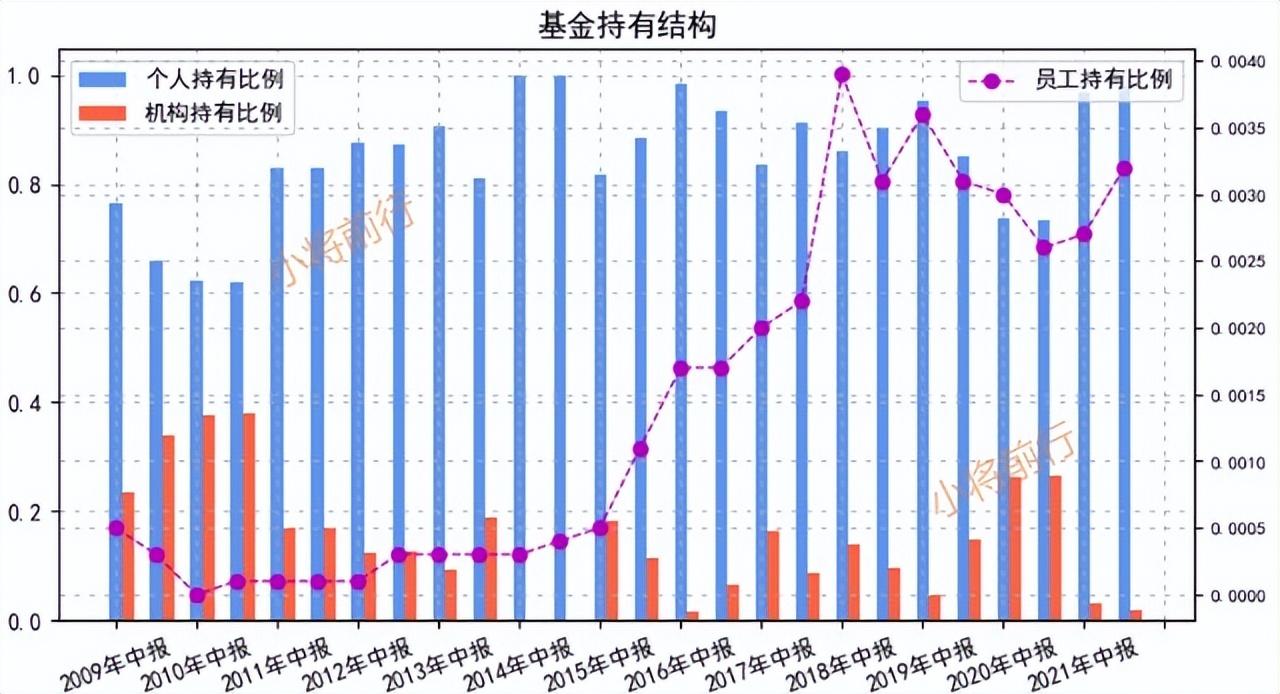 员工持有比例目前超过0.3%,十年以来处于一个震荡向上的过程,自己持有自己基金的份额在变高,这是好现象。在选择主动基金投资过程中,这是一个非常重要的参考指标,基金被更多的自己人持有,能不卖力吗。
