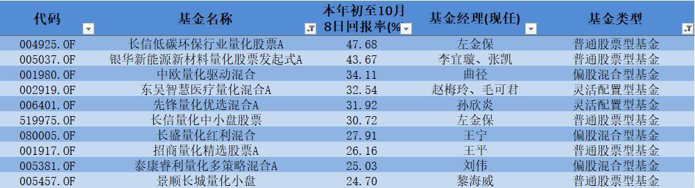 年初至今,业绩回报居前的10只产品分别是长信低碳环保行业量化股票A、银华新能源新材料量化股票发起式A、中欧量化驱动、东吴智慧医疗量化混合A、先锋量化优选混合A、长信量化中小盘股票、长盛量化红利混合、招商量化精选A、泰康睿利量化多策略混合A和景顺长城量化小盘,各自业绩情况为47.68%、43.67%、34.11%、32.54%、31.92%、30.72%、27.91%、26.16%、25.03%和24.70%。