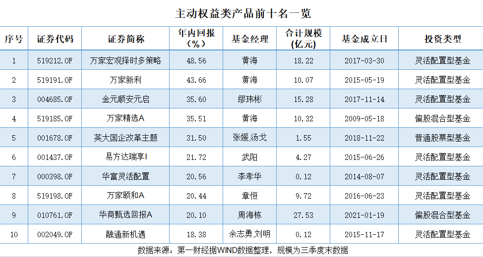 具体而言,万家宏观择时多策略、万家新利延续了一段时间以来的领先表现,最终分别以48.56%、43.66%的年内收益率获得冠亚军,二者均有由黄海管理。这也是目前主动权益基金中唯二的业绩超40%的产品。