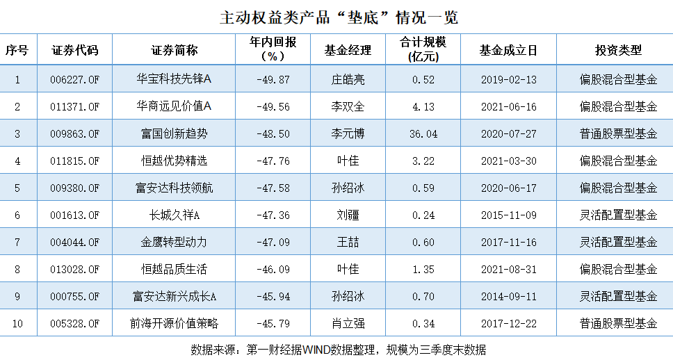 其中,庄皓亮管理的华宝科技先锋A在主动权益类产品中业绩排名倒数第一,2022年的累计跌幅达49.87%,接近“腰斩”。此外,李双全管理的华商远见价值A、李元博管理的富国创新趋势,分别以49.56%、48.5%的跌幅,分列倒数第二、第三位。