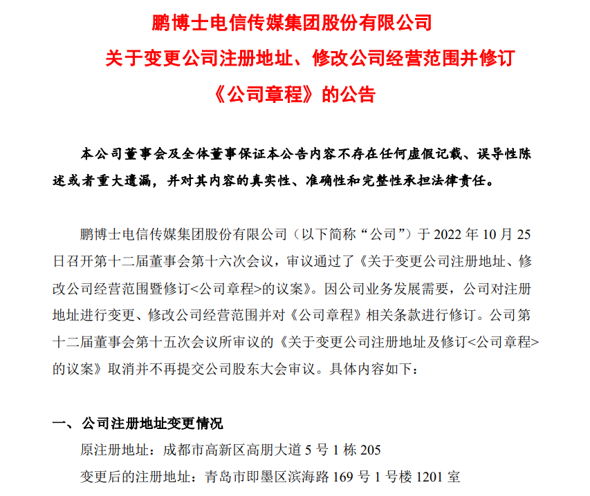 2022年10月18日,鹏博士发布公告称,鹏博士集团注册地址将由成都变更至青岛。本次迁址将推动鹏博士在算力网络、行业云、大数据中心等业务的积极发展。