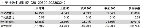 可以看到中证云计算与大数据主题指数2012年6月29日以来的年化收益为14.93%,年化夏普比为0.59,展现出较高的收益弹性
