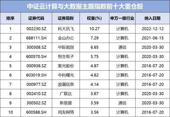 其中前十大权重股包含了科大讯飞、金山办公和恒生电子等云计算与大数据龙头企业,