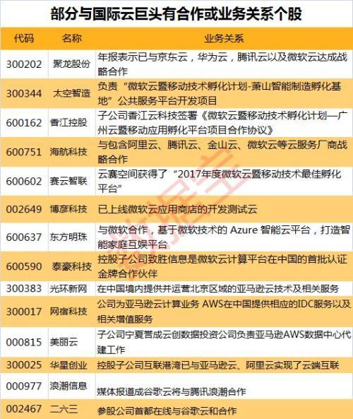 与国际云巨头有合作关系的股票是本次云计算行情炒作核心,如二六三参股公司首都在线与谷歌云和合作,已经三连板;美丽云子公司宁夏誉成云创数据投资公司还负责亚马逊AWS数据中心代建工作,也已经三连板。周五类似原因涨停的还有聚龙股份、太空智造、香江控股、海航科技等个股。