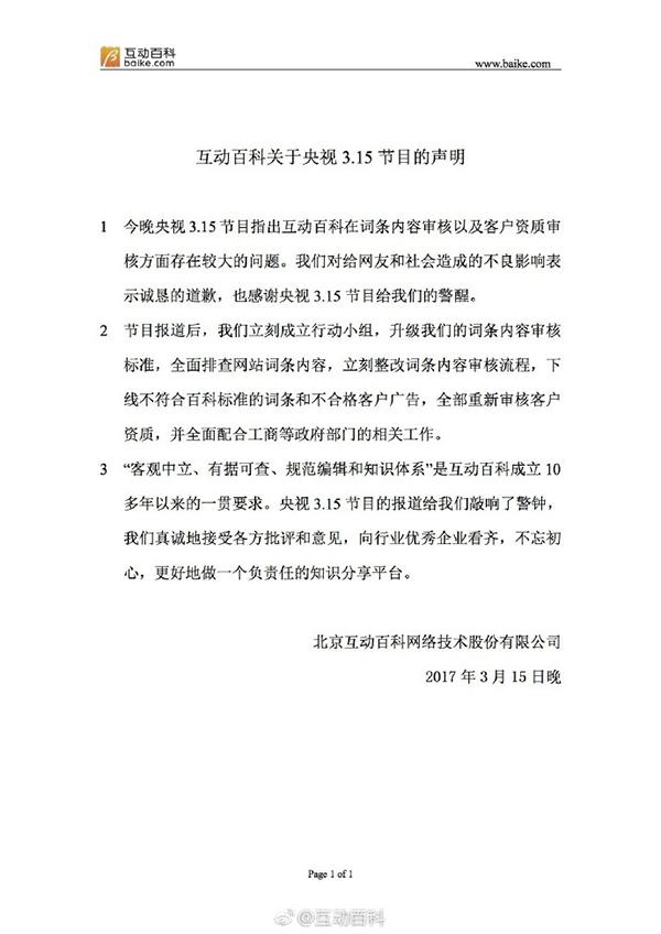 3月15日深夜,互动百科官方微博紧急发布关于央视3·15节目的声明称,节目报道后公司已成立行动小组,升级词条内容审核标准,全面排查网站词条内容,立刻整改词条内容审核流程,下线不符合百科标准的词条和不合格客户广告,全部重新审核客户资质,并全面配合工商等政府部门的相关工作。
