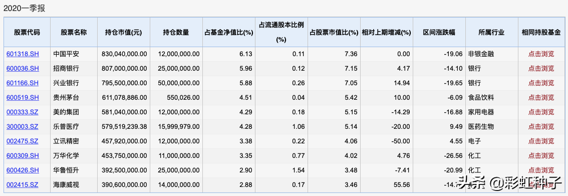 前十大重仓股分别是:中国平安、招商银行、兴业银行、贵州茅台、美的集团、乐普医疗、立讯精密、万华化学、华鲁恒升和海康威视。