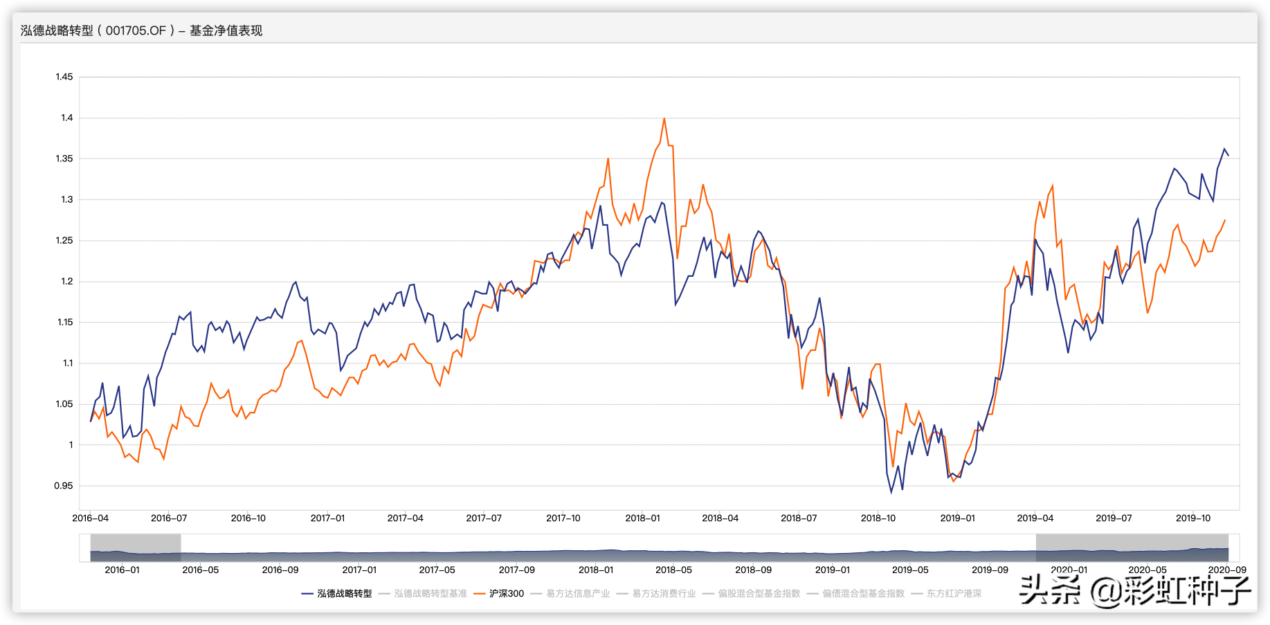 :由于在长盛基金的管理时间还太短,我们需要去看一下郭堃先生在泓德基金时的业绩表现,从下图中,你可以看到,从16年4月到19年11月,郭堃先生当时管理的泓德战略转型基金(001705)的表现,只能说是平常,和沪深300指数基本上旗鼓相当。