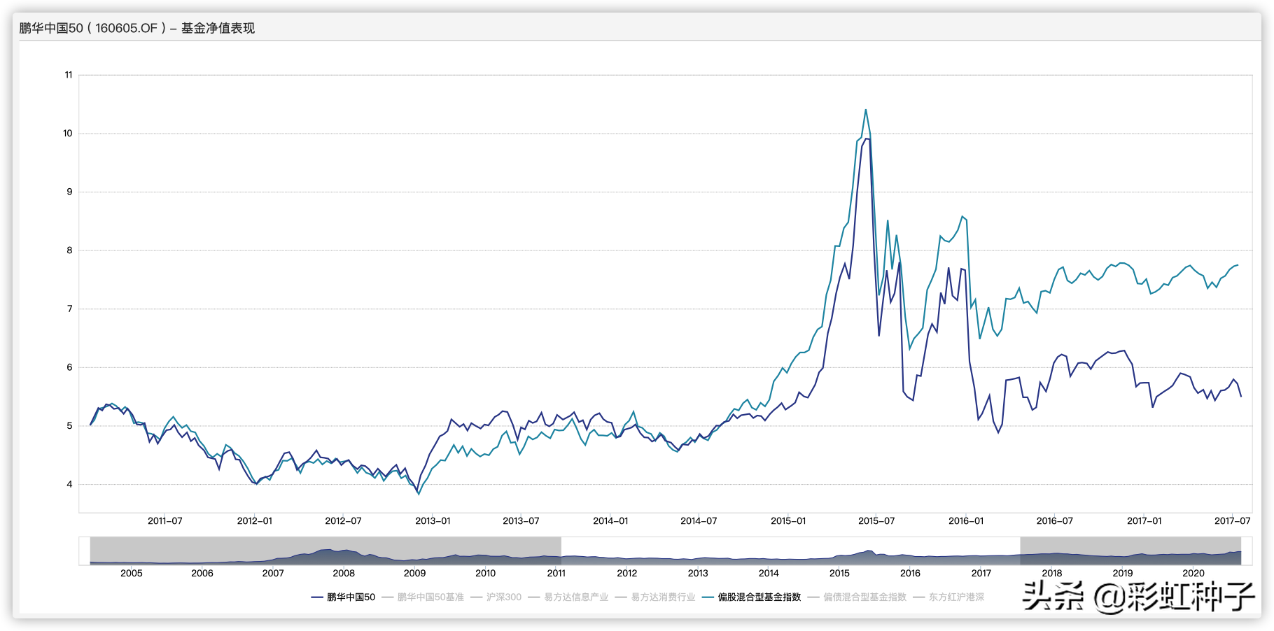 由于陈鹏先生在安信基金管理时间比较短,园长去看了下他在鹏华基金任职期间的表现,拿他在鹏华基金管理时间最长的基金鹏华中国50基金来看,从2011年1月到2017年7月,这6年半的时间里,该基金的表现可以用惨淡来形容,净值从5元上涨到5.5元,仅上涨了10%,大幅跑输同期沪深300指数。