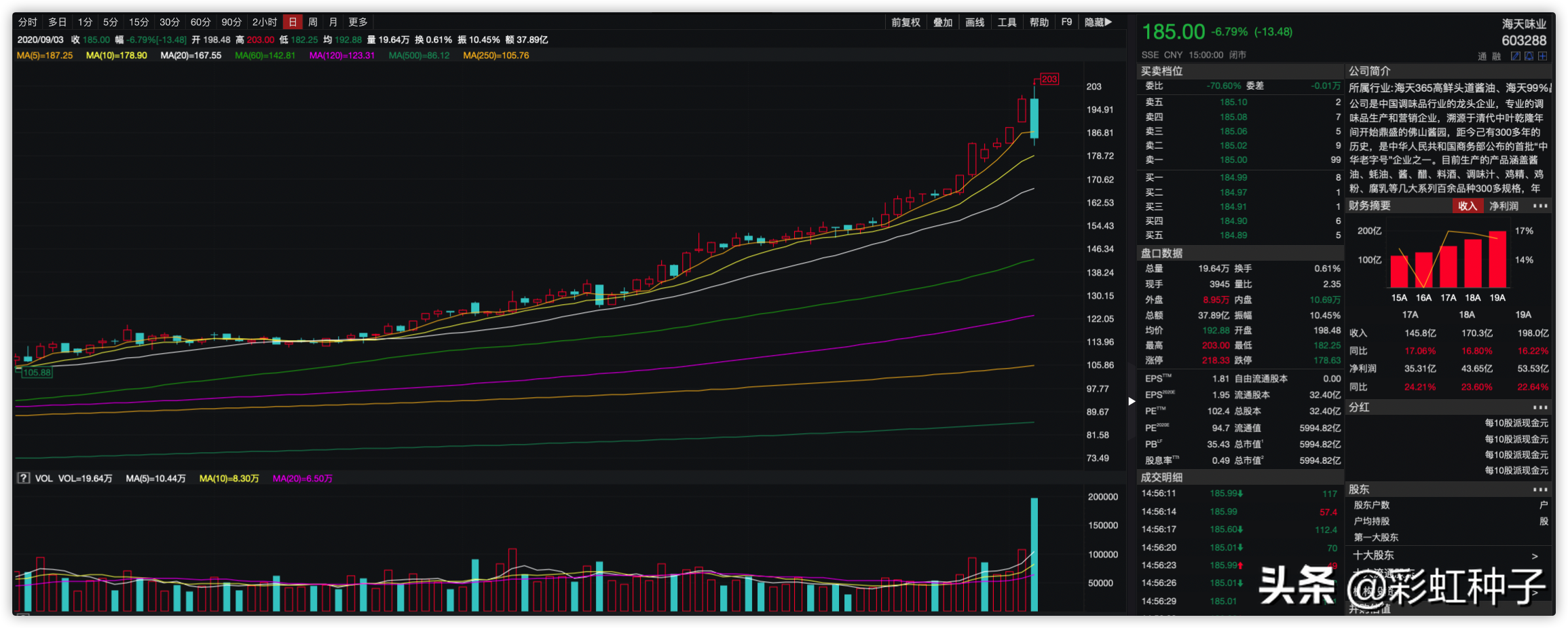 今天股票中,最大的焦点,大概就是海天味业突破200元/股后的大跌了吧。