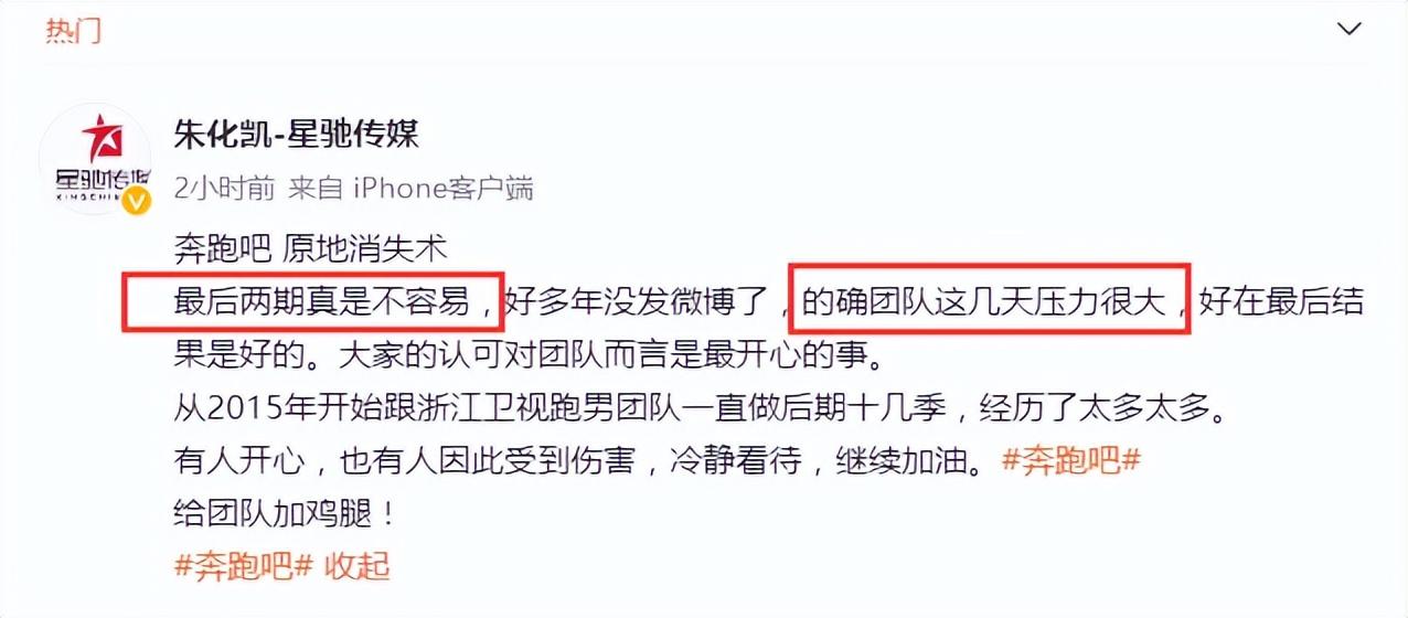 感 觉 经 此 一 役 , 后 期 工 作 人 员 将 来 跳 槽 的 时 候 , 可 以 在 履 历 上 加 一 句 : 临 危 受 命 帮 《 奔 跑 吧 》 P 掉 蔡 徐 坤 , 工 作 成 果 受 到 领 导 和 观 众 一 致 好 评 , 收 视 率 创 下 历 年 最 高 。