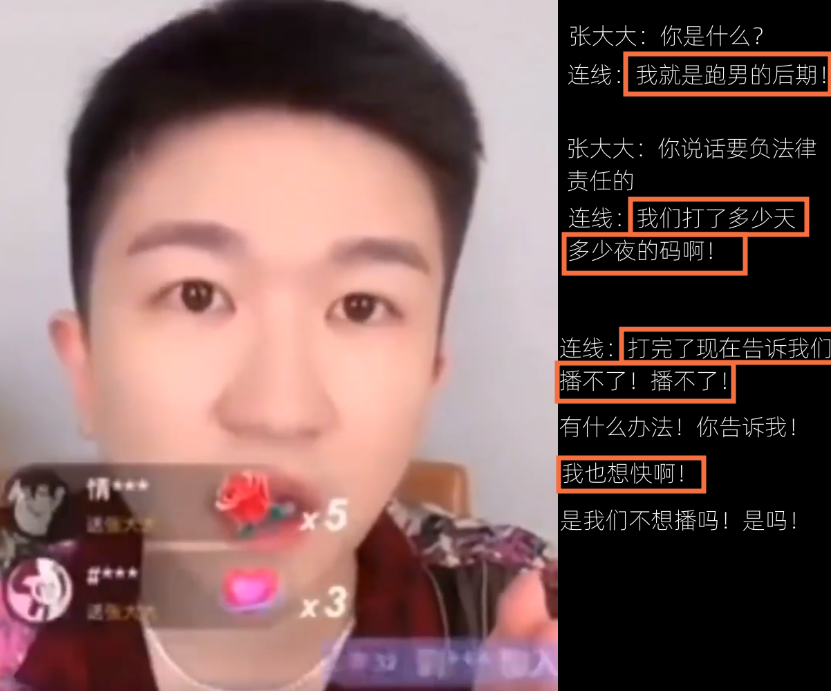 突 然 就 理 解 了 , 之 前 那 位 后 期 工 作 人 员 , 为 什 么 会 在 张 大 大 的 直 播 间 那 么 崩 溃 了 。