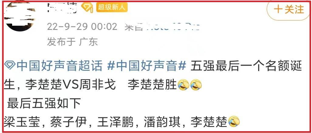 李楚楚在11进5的下半场晋级后,《好声音2022》全国五强正式诞生,分别是李荣浩战队的蔡子伊和李楚楚、李克勤战队的梁玉莹、梁静茹战队的潘韵淇以及李玟战队的王泽鹏。
